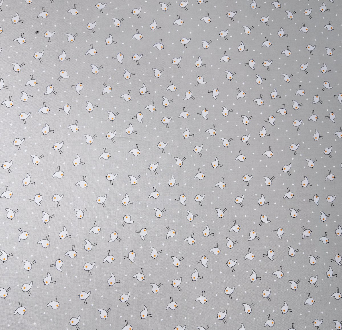 IMPRI-011 – De petits oiseaux stylisés se promènent sur un fond gris doux parsemé de pois blancs. Ce tissu respire la simplicité joyeuse et la tendresse du quotidien.