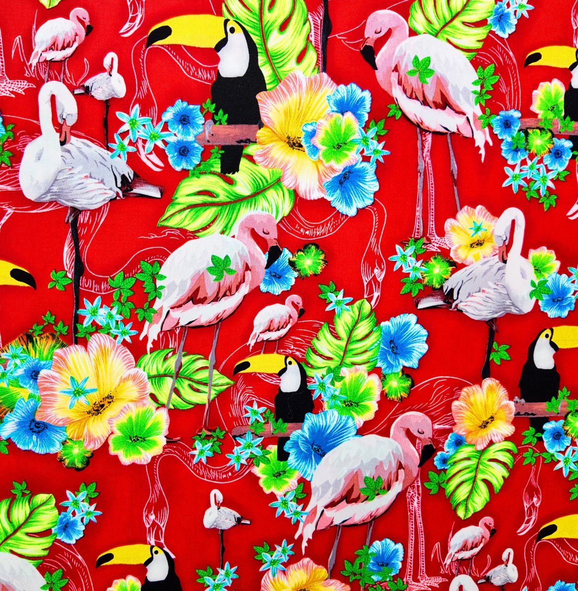 IMPRI-012 – Flamants roses et toucans se côtoient au milieu d’un foisonnement de fleurs tropicales éclatantes. Ce tissu évoque la chaleur et la vitalité des îles.