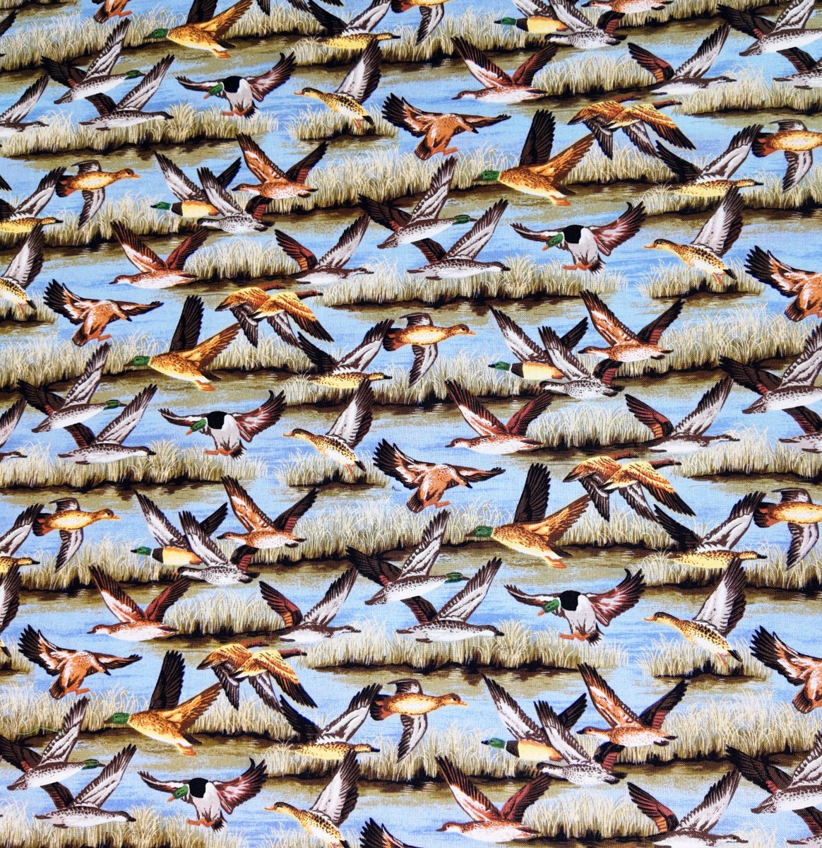 IMPRI-016 – Une nuée de canards survole un paysage de marais dorés sous un ciel clair. Ce tissu respire la liberté et le souffle du grand air.