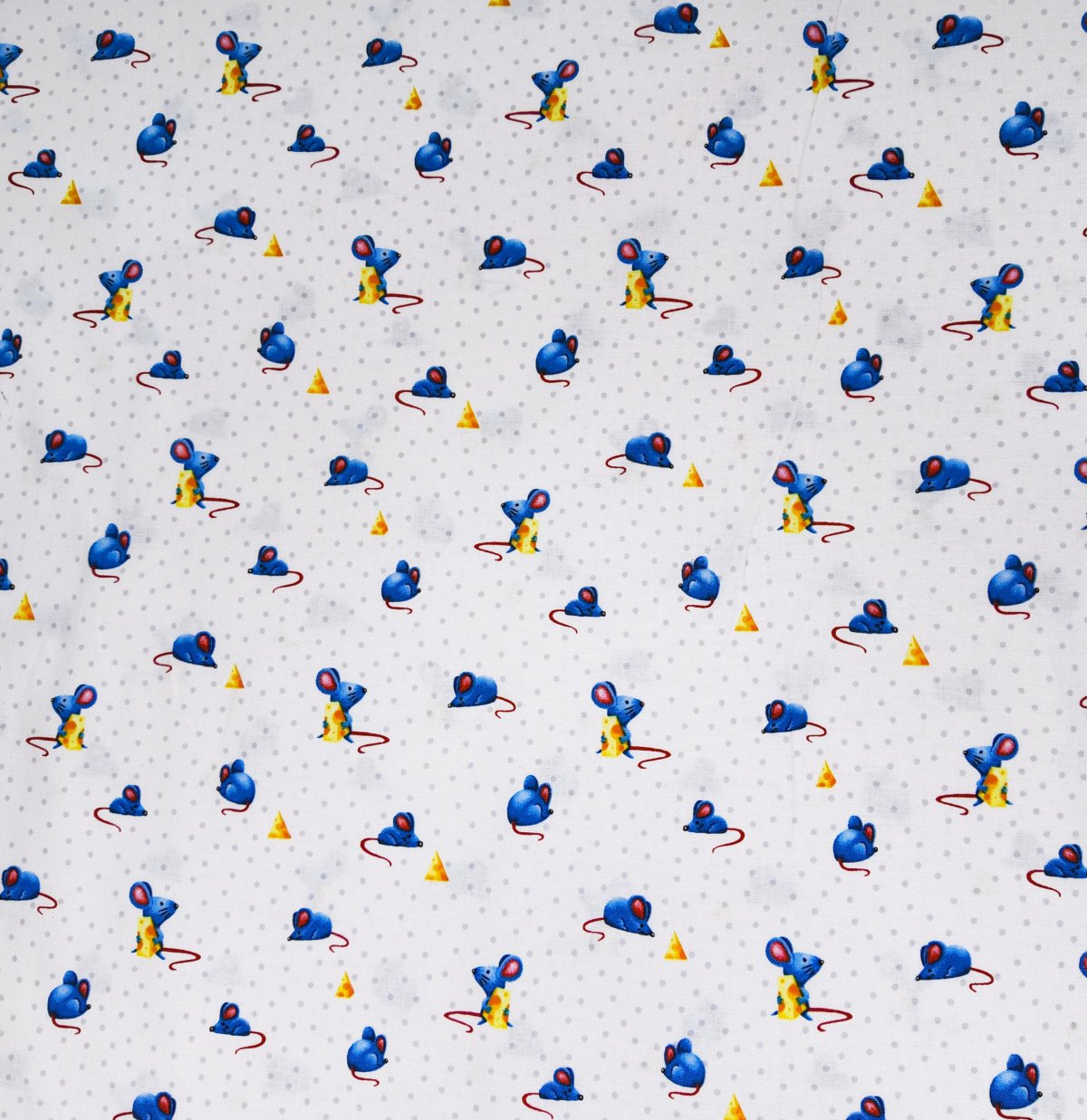 IMPRI-024– Petites souris bleues jouant autour de morceaux de fromage sur fond clair à pois. Un tissu plein d’humour et de légèreté.