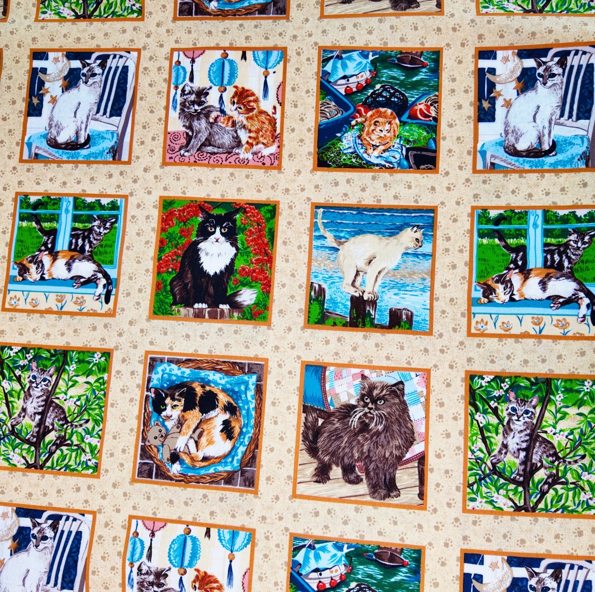 IMPRI-028 – Tableaux miniatures de chats au bord de mer et à la campagne, sur fond beige à empreintes douces. Une ode à la tendresse animale.