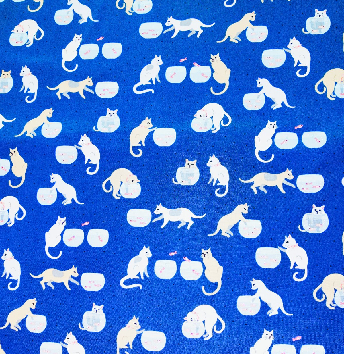 IMPRI-029 – Chats clairs jouant avec des poissons rouges dans leurs bocaux sur un fond bleu profond. Un univers à la fois drôle et paisible.