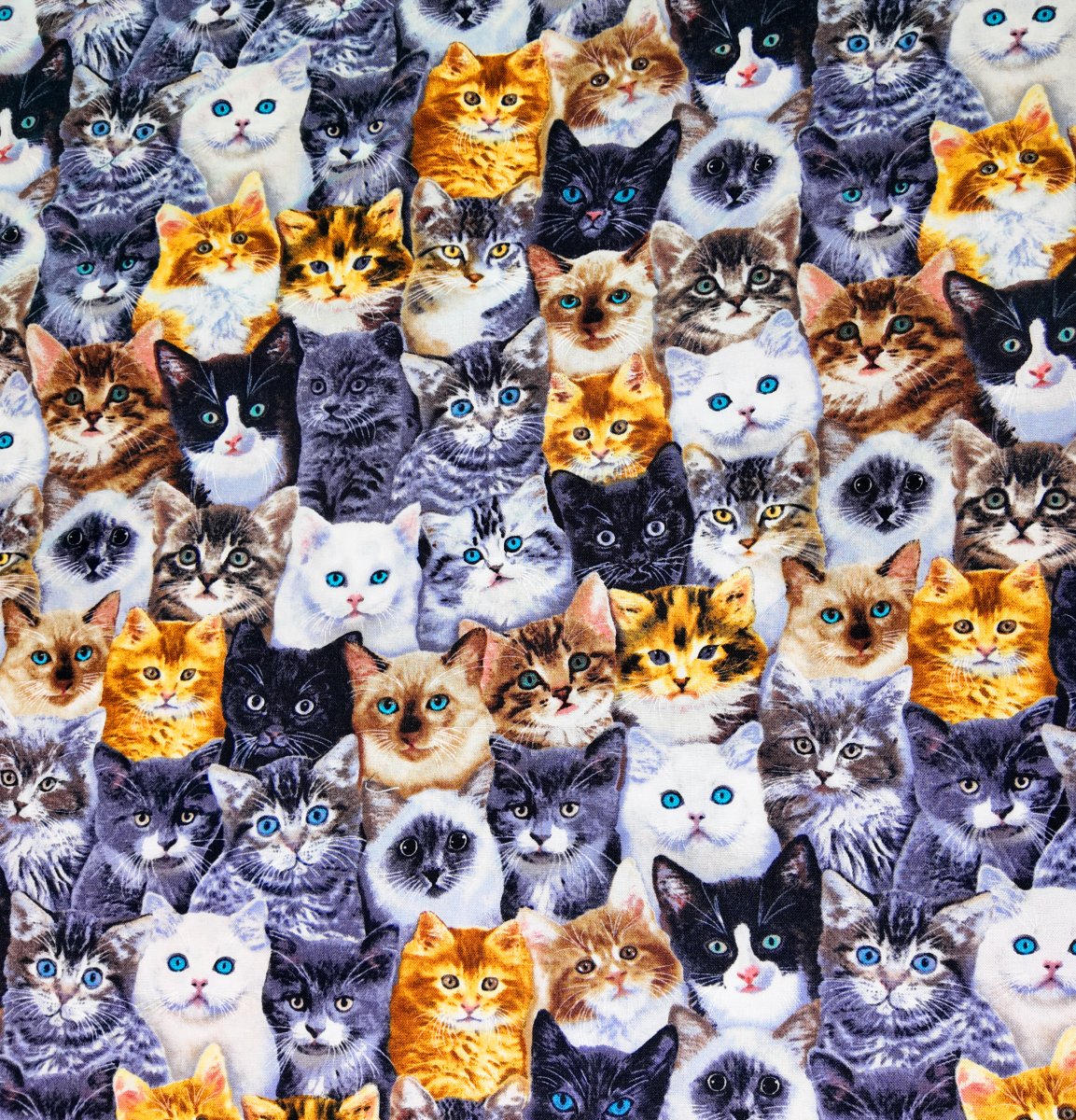 IMPRI-032 – Tissu foisonnant de têtes de chats aux pelages variés, du gris doux au roux flamboyant, ponctué de regards turquoise et or. Un univers félin plein de vitalité et de tendresse.