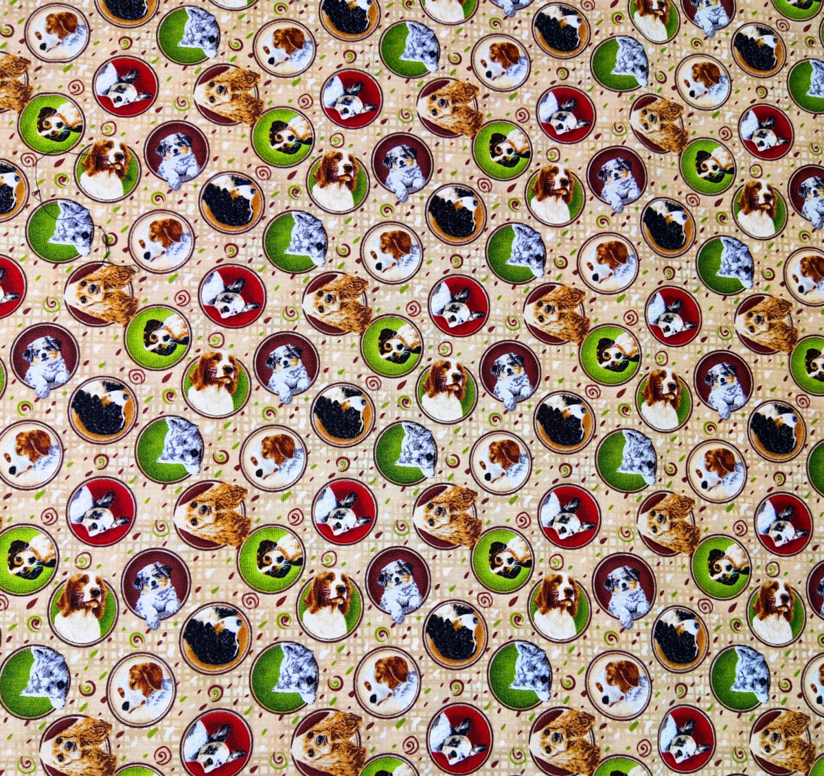 IMPRI-034 – Ensemble joyeux de petits chiens et chats en médaillons colorés sur fond beige festif. Un tissu plein de malice, idéal pour accessoires ou univers enfantin.