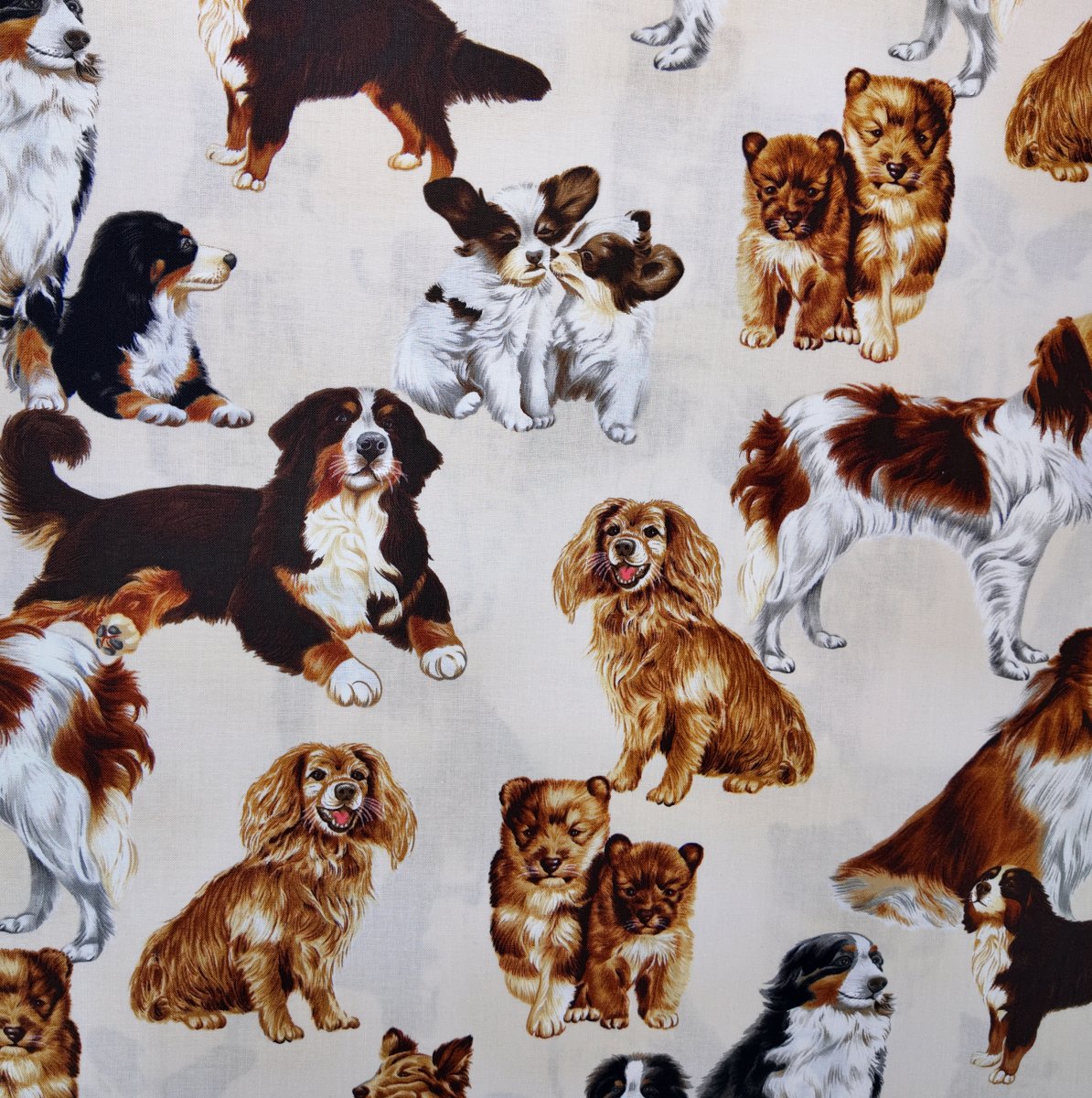 IMPRI-043 De grands et petits chiens s’amusent sur fond beige, entre jeux, câlins et tendresse. Leurs pelages soyeux et leurs poses complices évoquent la douceur d’un foyer aimant.