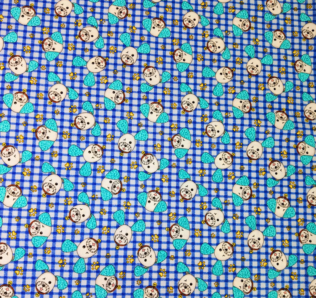 IMPRI-044 Un motif gai et enfantin de têtes de chiens stylisées sur fond à carreaux bleus, ponctué de fleurs jaunes. Un tissu joyeux et lumineux.