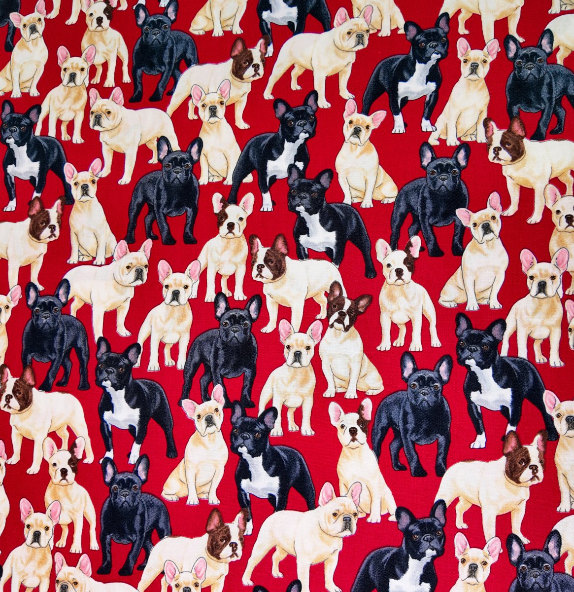 IMPRI-046 Une joyeuse assemblée de bouledogues français sur fond rouge éclatant. Leurs oreilles dressées et leurs mines vives insufflent énergie et bonne humeur.