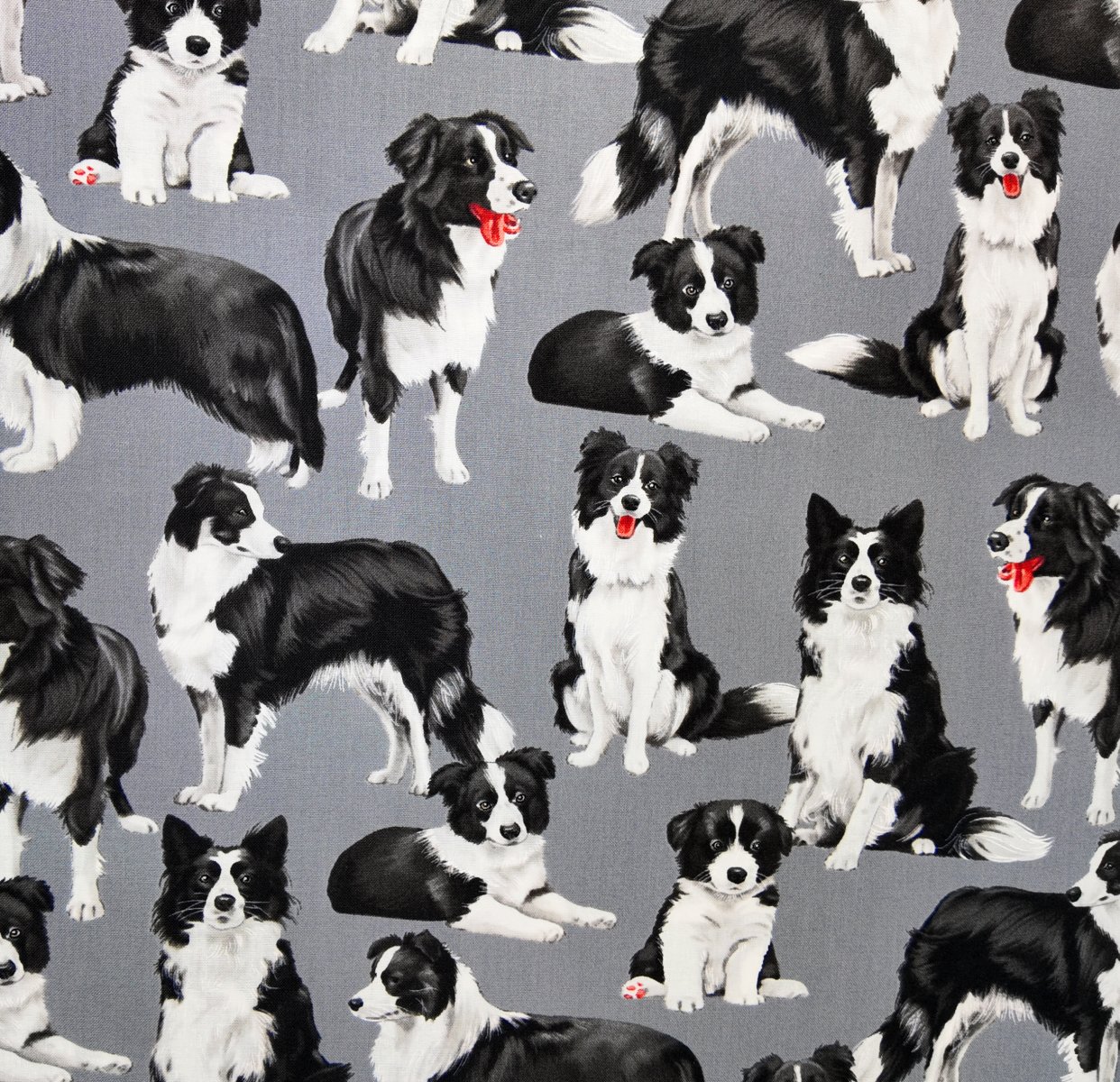 IMPRI-048 Élégants border collies noirs et blancs se détachent sur fond gris perle. Leurs postures attentives et pleines de douceur évoquent la fidélité et la sérénité.