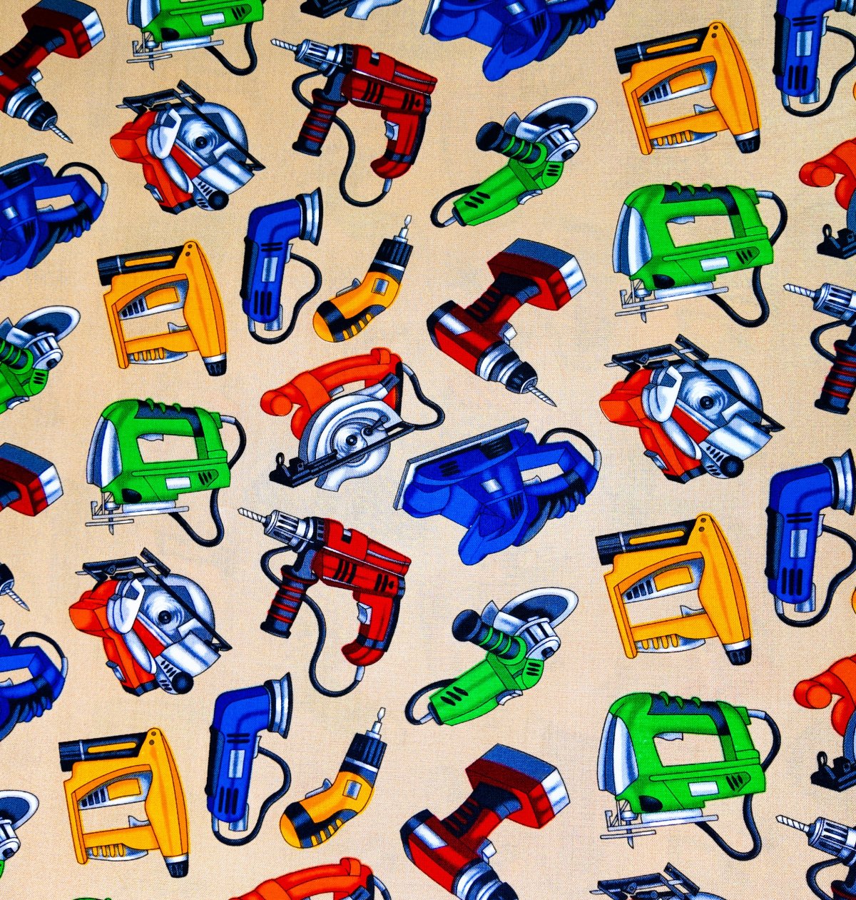 IMPRI-049 Un festival d’outils colorés sur fond beige évoque l’atelier en pleine activité. Scies, perceuses et visseuses s’entremêlent dans un joyeux ballet mécanique.