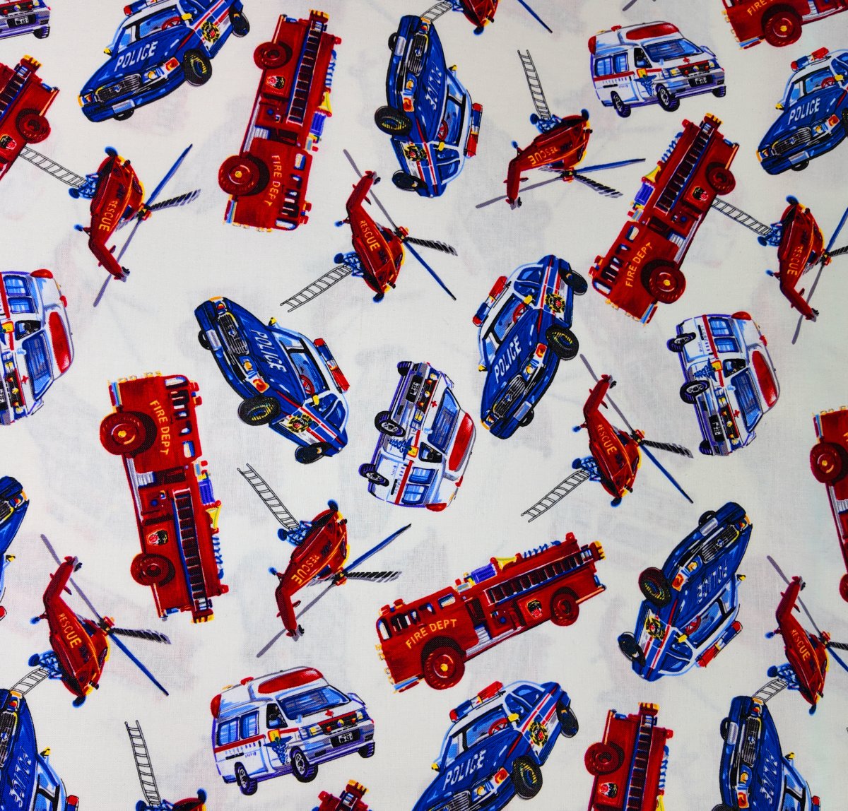 IMPRI-053 – Une symphonie lumineuse de véhicules de secours sur fond blanc : camions rouges, hélicoptères et voitures bleues dessinent une chorégraphie héroïque. Le tissu respire la vivacité et la solidarité des secours en mission.