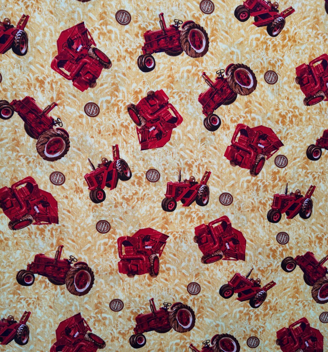 IMPRI-059 – Sur un fond doré évoquant les champs de blé, de solides tracteurs rouges se déploient avec puissance et fierté. Ce motif vibrant respire la moisson, la chaleur et le rythme du travail agricole.