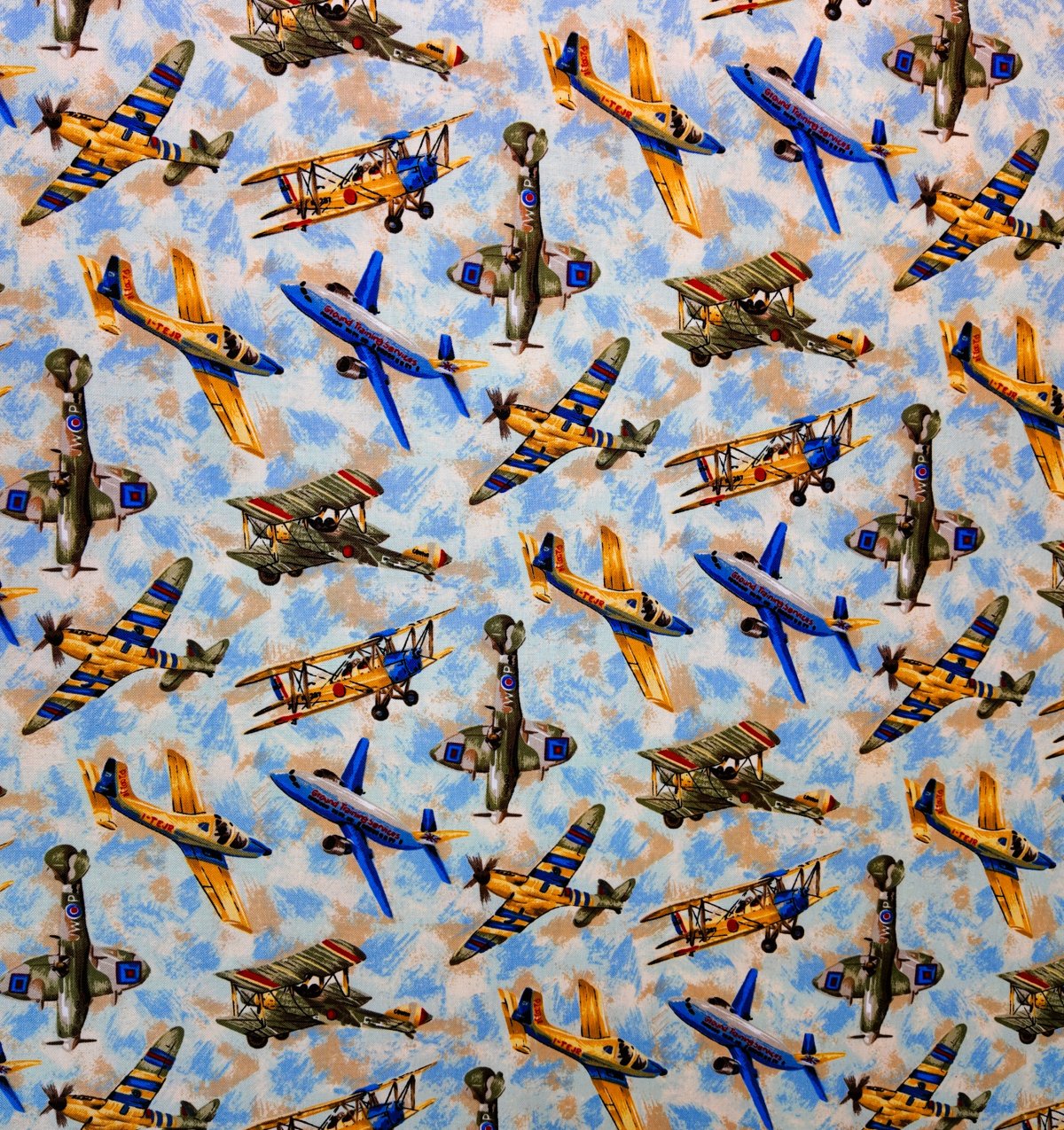 IMPRI-061 – Des avions de légende sillonnent un ciel nuageux aux teintes bleues et dorées. Le tissu capture la magie du vol et l’élégance des appareils d’époque, dans une atmosphère de liberté aérienne.