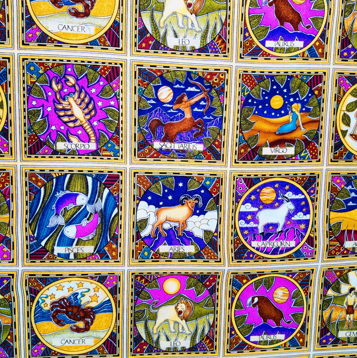 IMPRI-065 – Une mosaïque d’inspiration céleste où chaque carré illustre un signe du zodiaque dans des tons riches et éclatants. Le tissu invite au rêve et à la contemplation des astres.