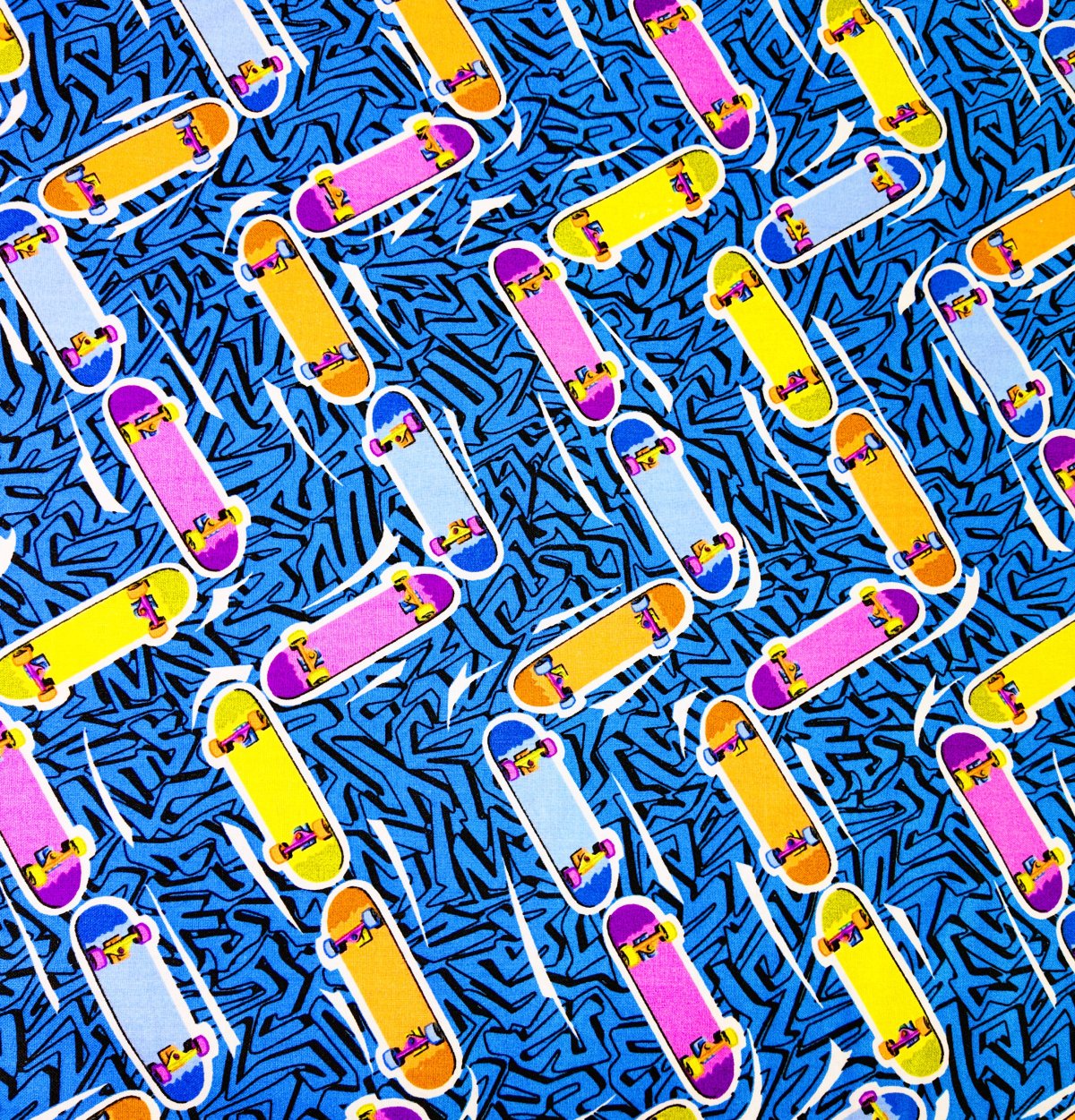 IMPRI-066 – Un tourbillon d’énergie urbaine : planches de skateboard colorées glissant sur fond bleu électrique. Le tissu respire la liberté, la vitesse et la créativité de la rue.
