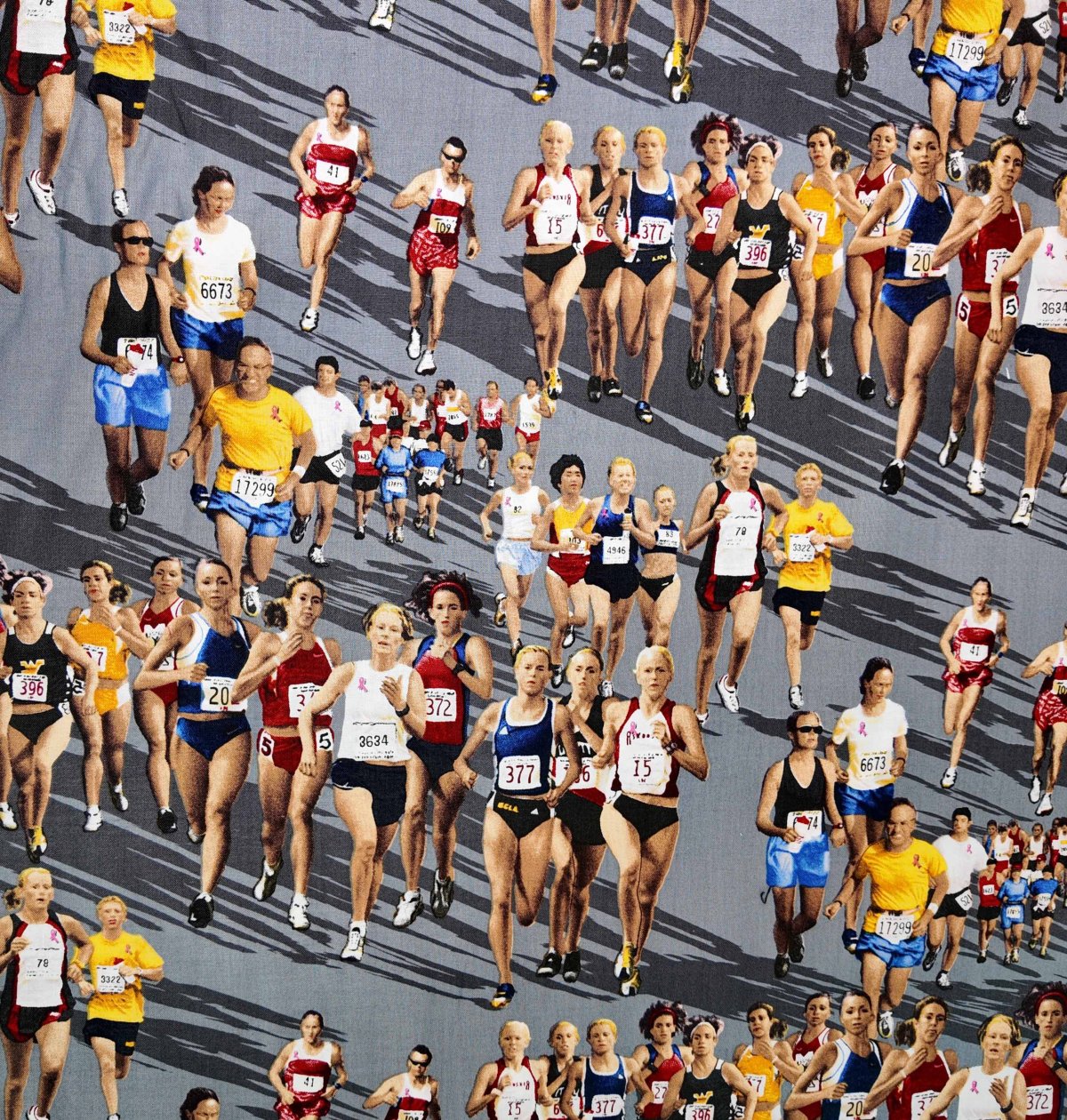 IMPRI-069 – Une foule de coureurs s’élance sur un sol gris, colorée par leurs tenues sportives. Le tissu capture l’énergie, la détermination et la vitalité d’une grande course en mouvement.