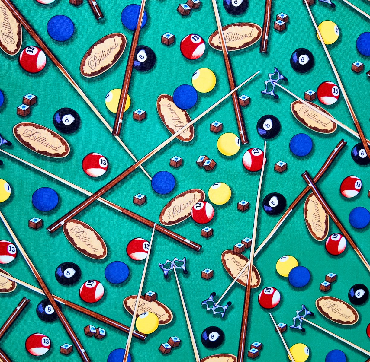 IMPRI-071 – Sur un vert profond, les billes de billard et les queues se croisent dans un jeu de lumière vif. Le tissu évoque l’élégance d’un salon de jeu et le plaisir de la concentration.