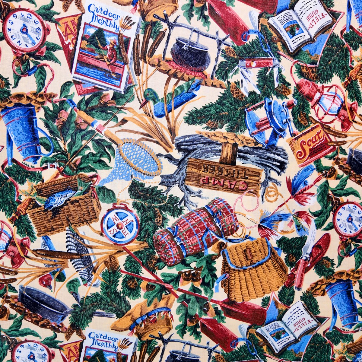 IMPRI-081 – Esprit d’évasion au grand air : paniers, lampes et livres se mêlent aux feuillages profonds. Les tons chauds et bleus rappellent les campements d’antan et le goût de l’aventure paisible.
