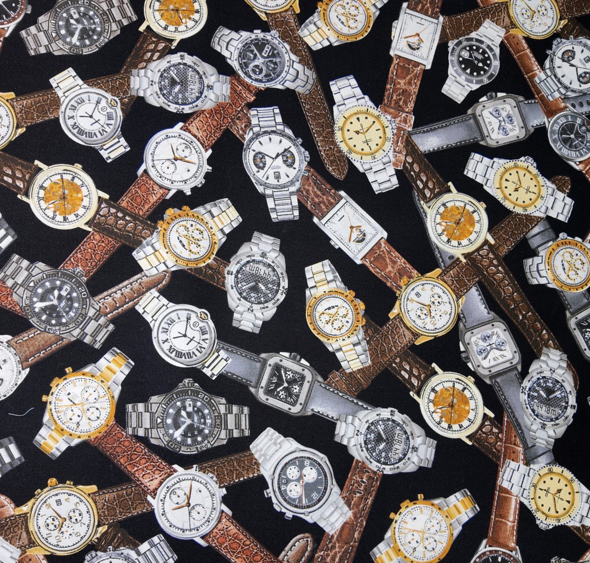 IMPRI-083 – Fond noir profond où scintillent des montres au métal clair et bracelets bruns. Un enchevêtrement lumineux qui évoque précision et élégance.