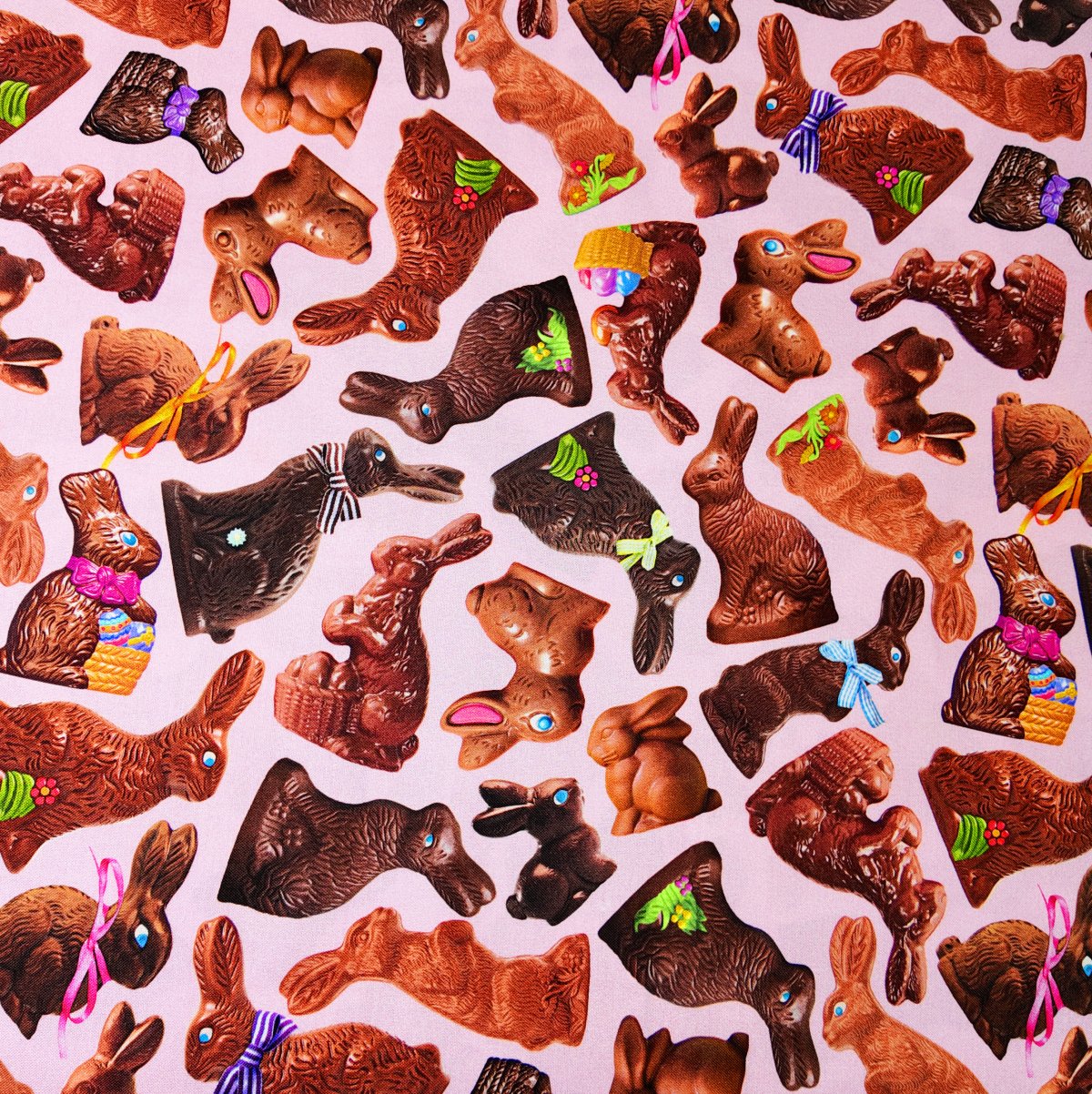 IMPRI-087 – Une farandole de lapins en chocolat anime un fond rose tendre, entre rubans et petits détails colorés. Ce tissu respire la douceur gourmande et la magie de Pâques.