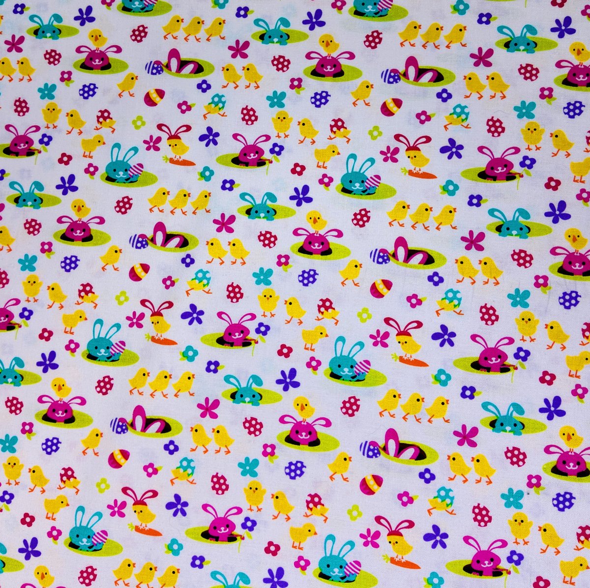 IMPRI-092 – Petits lapins joyeux, poussins et fleurs vives s’animent sur un fond clair dans une ambiance de fête. Ce tissu enchanteur respire la joie enfantine et la légèreté de Pâques.