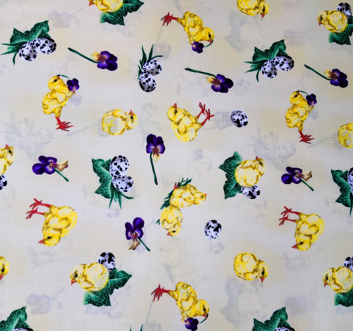 IMPRI-095 – Petits poussins et fleurs violettes se mêlent à des œufs mouchetés sur fond crème. Un tissu plein de charme champêtre et de fraîcheur printanière.