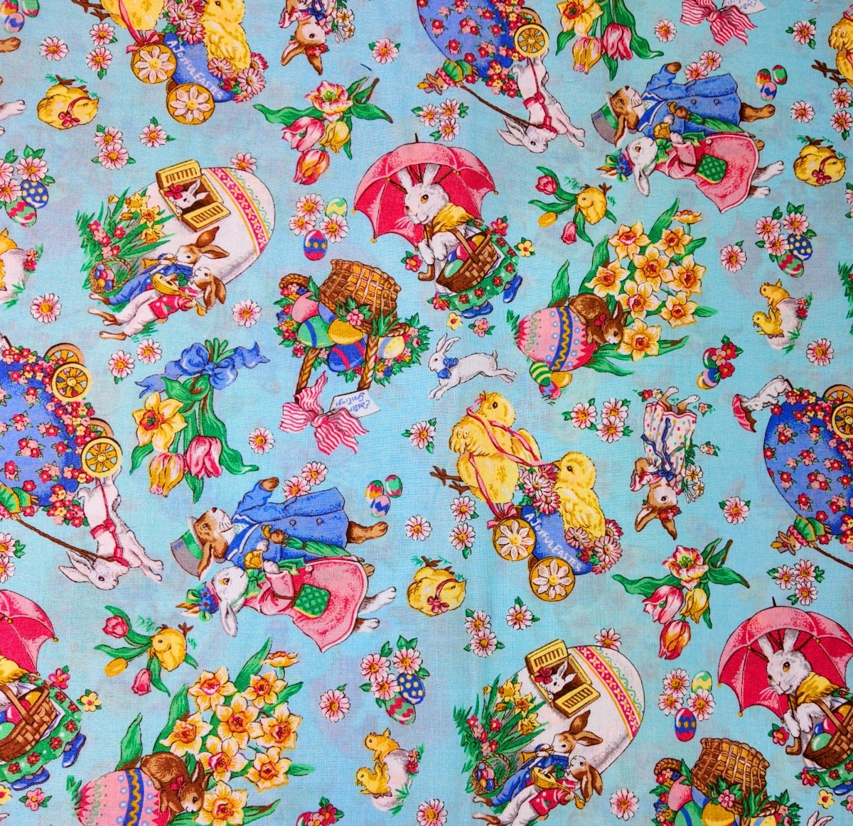 IMPRI-096 – Sur fond bleu ciel, des lapins élégants et des poussins tirent de charmantes carrioles fleuries. Ce tissu joyeux et raffiné célèbre la fantaisie printanière et les traditions de Pâques.