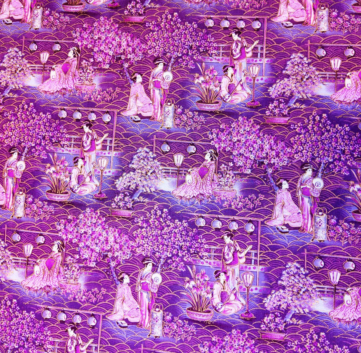 IMPRI-100 – Scène japonaise baignée de mauve et d’or, où des femmes en kimono flânent parmi les cerisiers en fleurs. Ce tissu délicat invite à la rêverie et à la beauté du printemps.