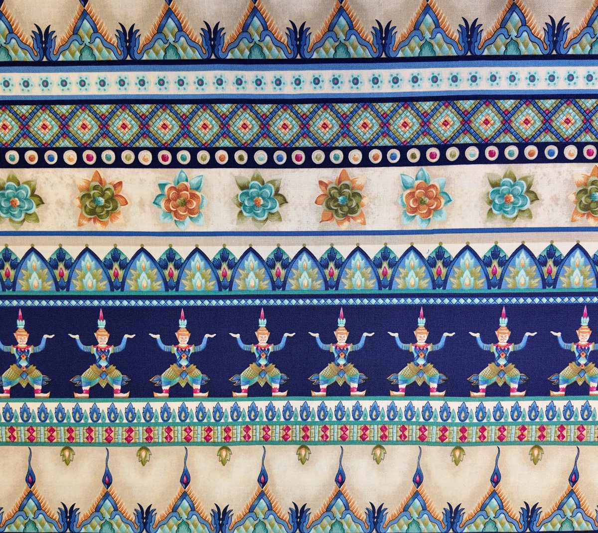 IMPRI-104 – Entre or et bleu profond, ce tissu célèbre l’art thaï avec ses danseurs stylisés, ses frises fleuries et ses motifs architecturaux. Une invitation au voyage entre temples, lotus et soie royale.