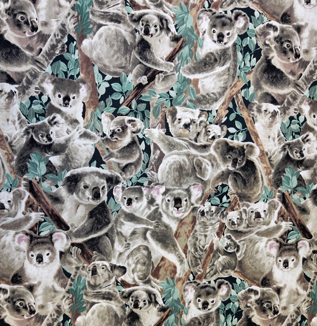 IMPRI-113 – Une colonie de koalas se blottit dans les branches d’eucalyptus, entre feuillage tendre et troncs bruns. Le tissu évoque la chaleur d’une forêt australienne peuplée de douceur.