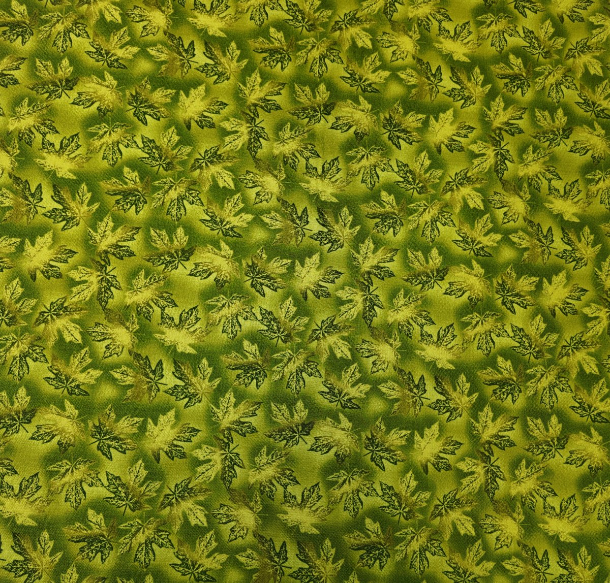IMPRI-125 – Feuilles d’érable et nuances vertes se mêlent dans une danse de lumière. Le tissu évoque la fraîcheur d’un matin de printemps.