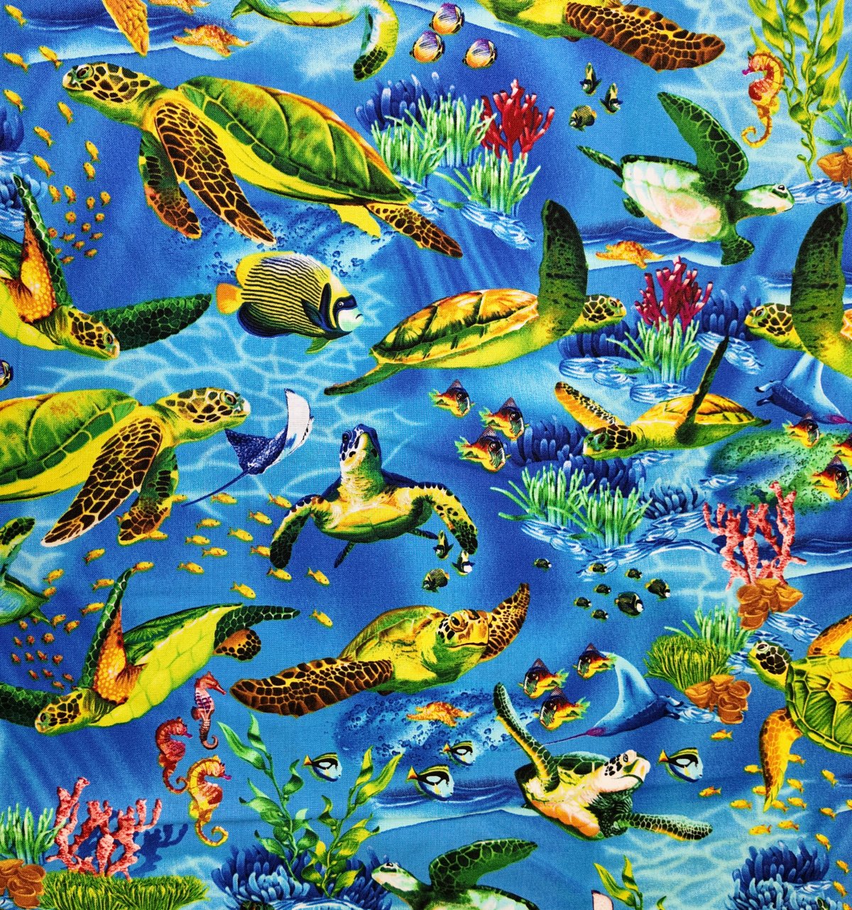 IMPRI-149 – Des tortues marines glissent entre coraux et poissons tropicaux, baignées de lumière turquoise. Un hymne à la vie océanique et à la liberté.