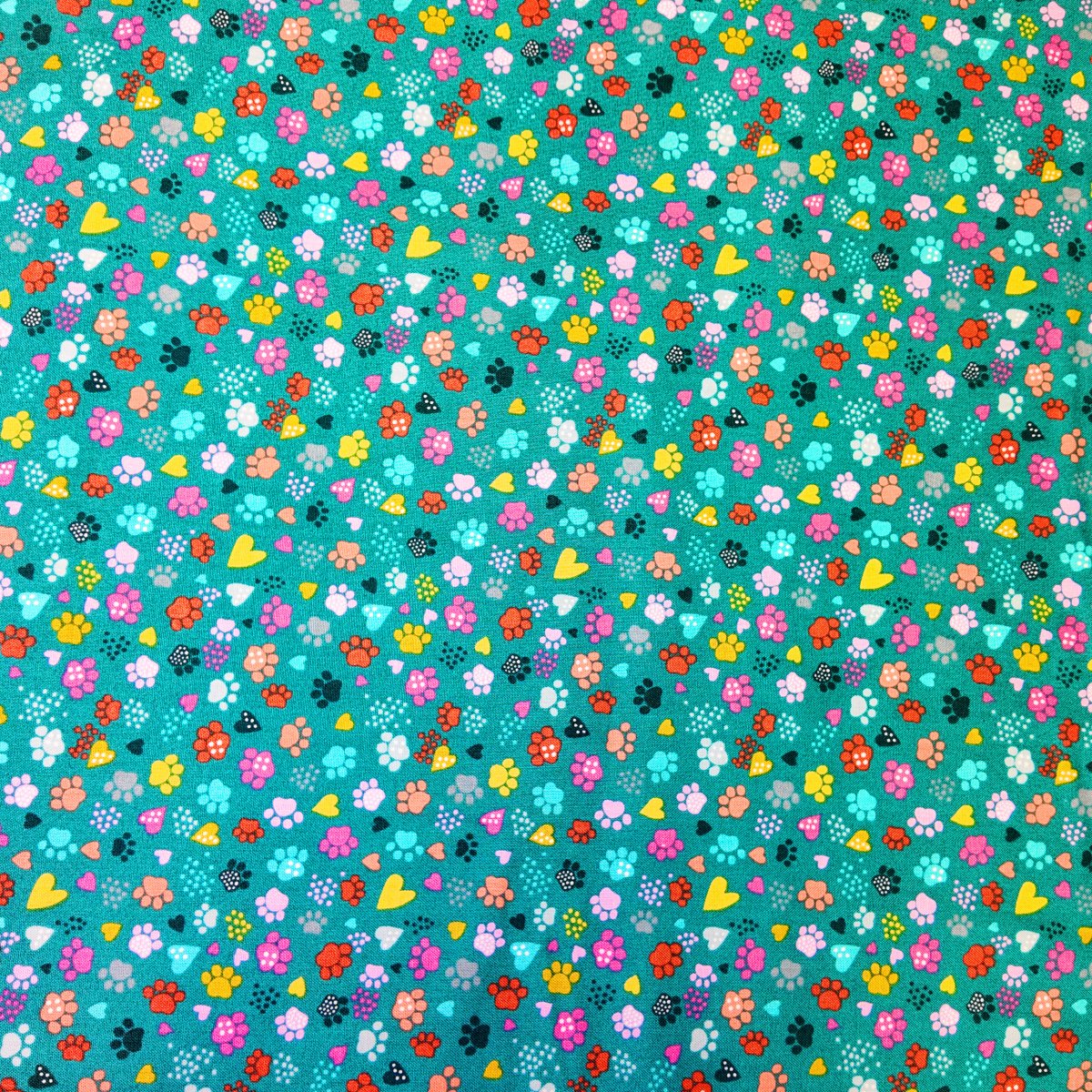 IMPRI-175 – Une pluie de petites empreintes multicolores se mêle à des cœurs et des pois sur fond turquoise. Ce motif pétillant respire la tendresse et la bonne humeur.