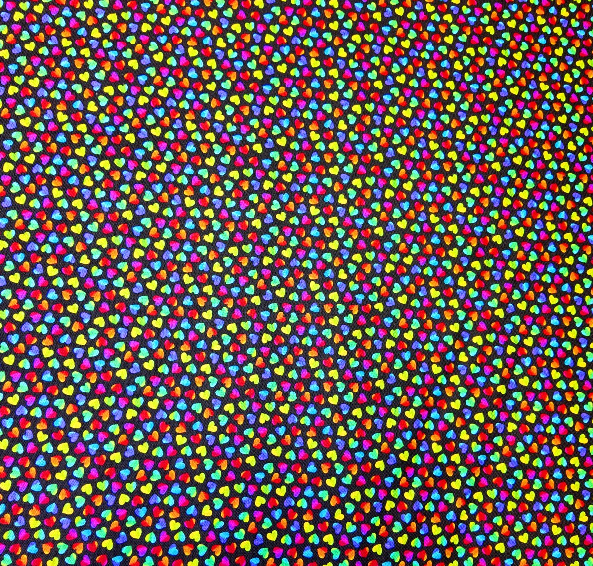 IMPRI-186 – Une pluie de petits cœurs multicolores illumine un fond noir profond. Ce contraste joyeux exprime l’amour et la fantaisie.