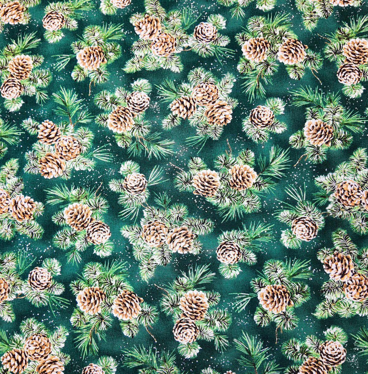 NOEL-002 – Fond vert forêt parsemé de pommes de pin dorées et d’aiguilles de sapin. Ce motif chaleureux rappelle les promenades enneigées et les senteurs résineuses de la montagne en hiver.