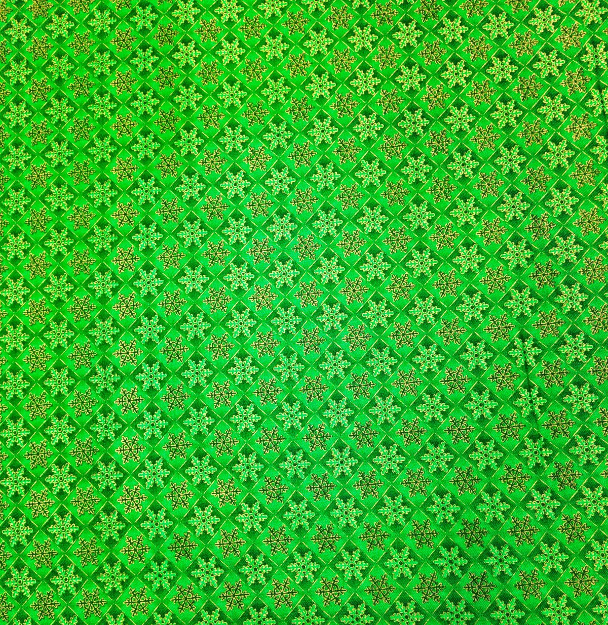 NOEL-013 – Motif régulier de flocons dorés sur fond vert éclatant. Ce tissu diffuse un éclat festif, comme une neige d’or tombant sur un sapin illuminé.