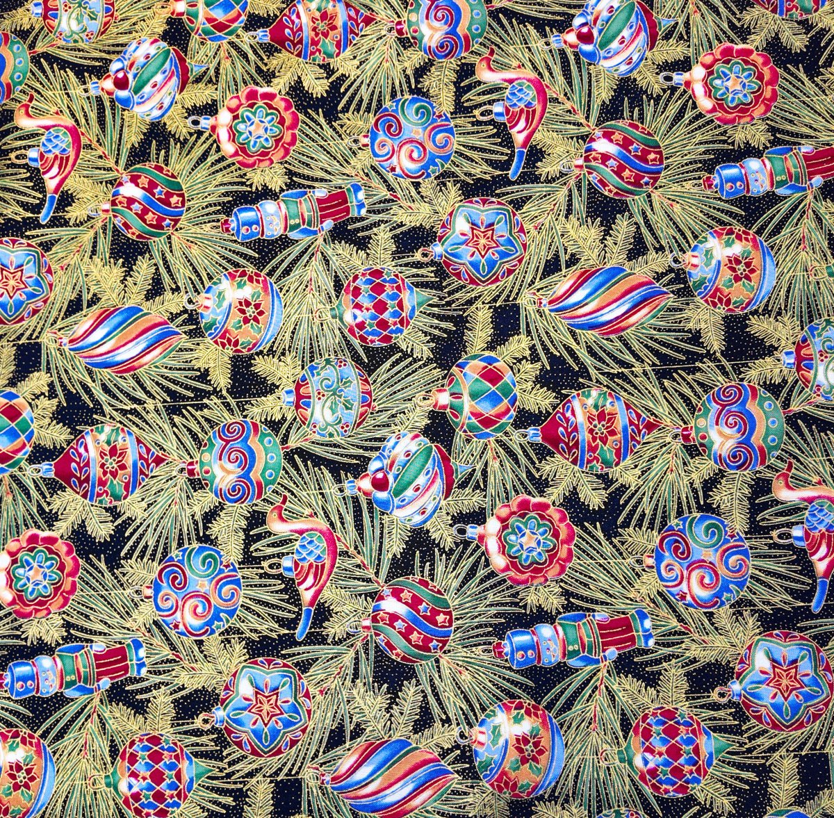 NOEL-025 – Boules de Noël richement décorées suspendues à des branches dorées sur fond nuit. L’ensemble brille d’un éclat festif, comme un sapin illuminé sous les étoiles.