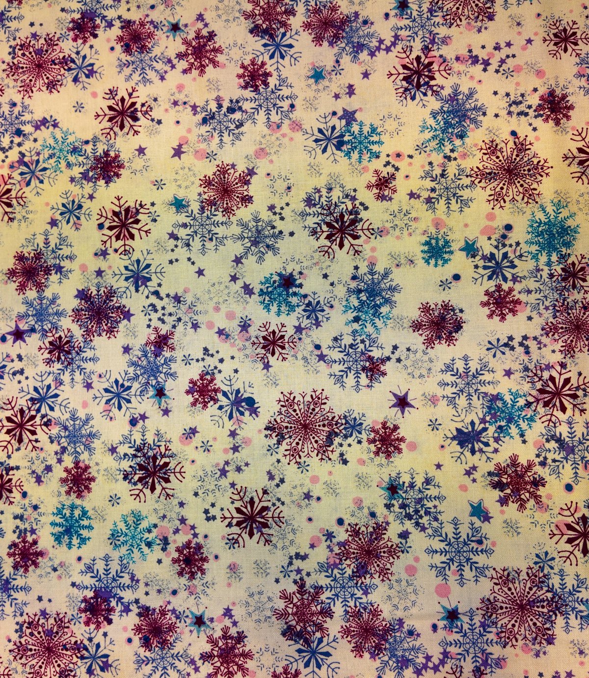 NOEL-040 – Des flocons éclatants en violet, bleu et rose se dispersent sur un fond doré pâle. Ce tissu illumine l’hiver d’une touche magique, entre rêve et féerie polaire.