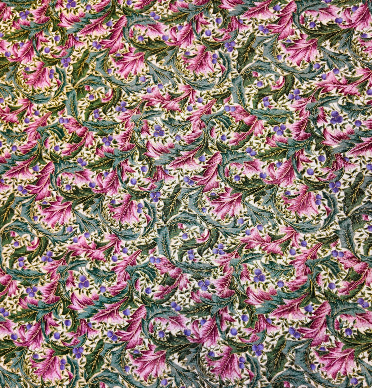 NOEL-050 – Un feuillage raffiné mêle vert profond, rose et violet dans un mouvement végétal et enchanteur. Ce tissu respire la nature stylisée, entre élégance florale et inspiration hivernale.