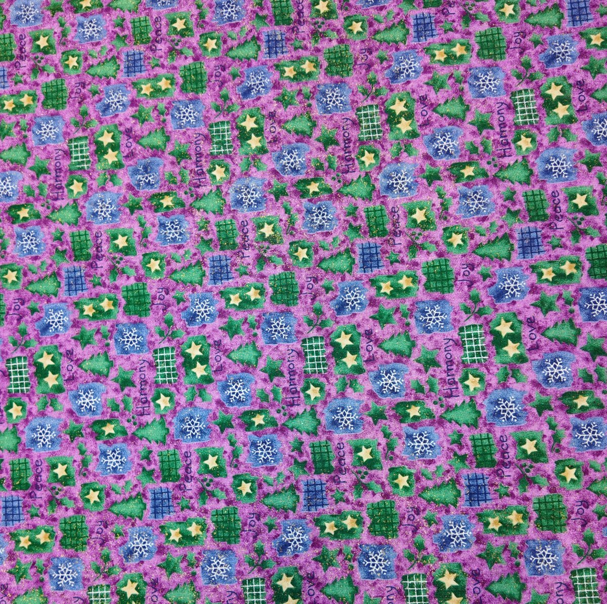 NOEL-057 – Un univers violet vif ponctué de sapins verts, d’étoiles jaunes et de flocons bleus. Ce tissu respire la fantaisie joyeuse d’un Noël coloré et lumineux.