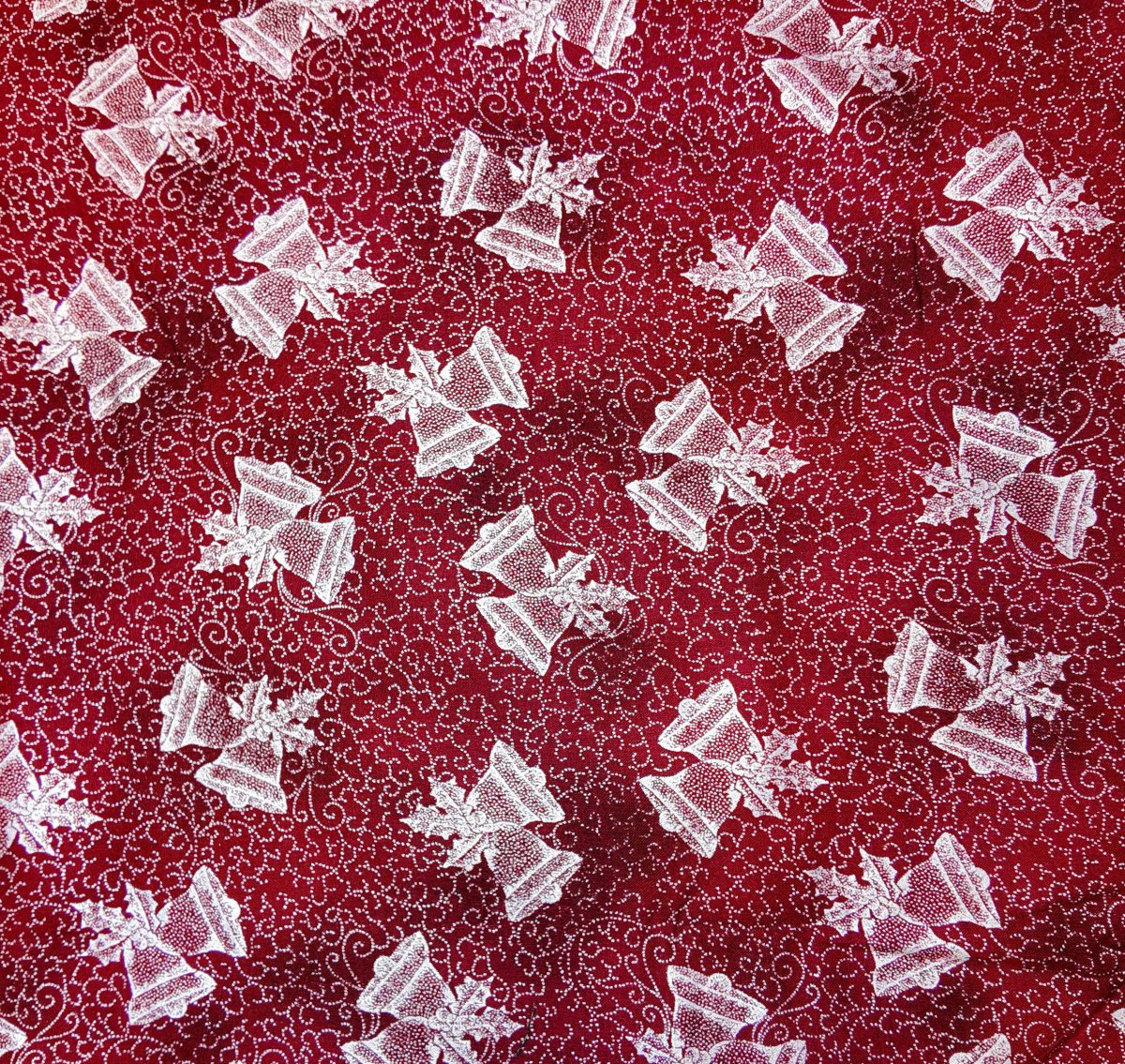 NOEL-066 – Un rouge profond orné de cloches blanches délicatement dessinées, entrelacées de volutes fines. Ce tissu évoque le tintement joyeux et classique des fêtes de Noël.