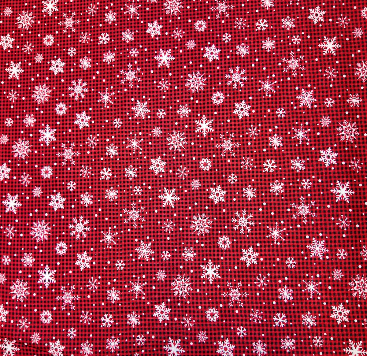 NOEL-069 – Sur un fond rouge quadrillé, des flocons blancs se posent avec légèreté comme une neige fine d’hiver. Ce tissu évoque la chaleur d’un chalet sous la neige.