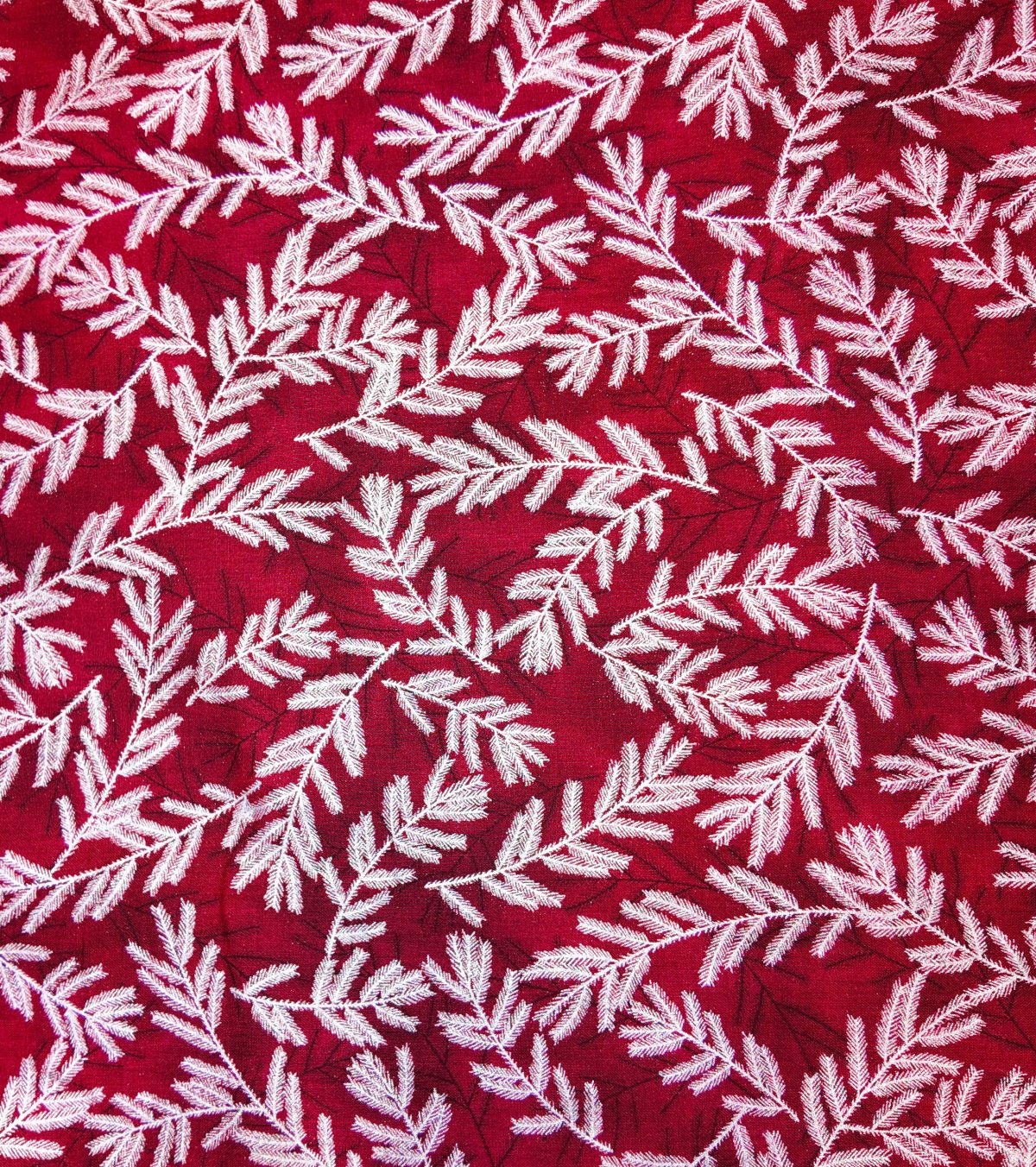 NOEL-070 – Des branches givrées blanches s’étendent sur un fond rouge profond. Ce tissu inspire la fraîcheur d’un matin de décembre, entre givre et feu de cheminée.
