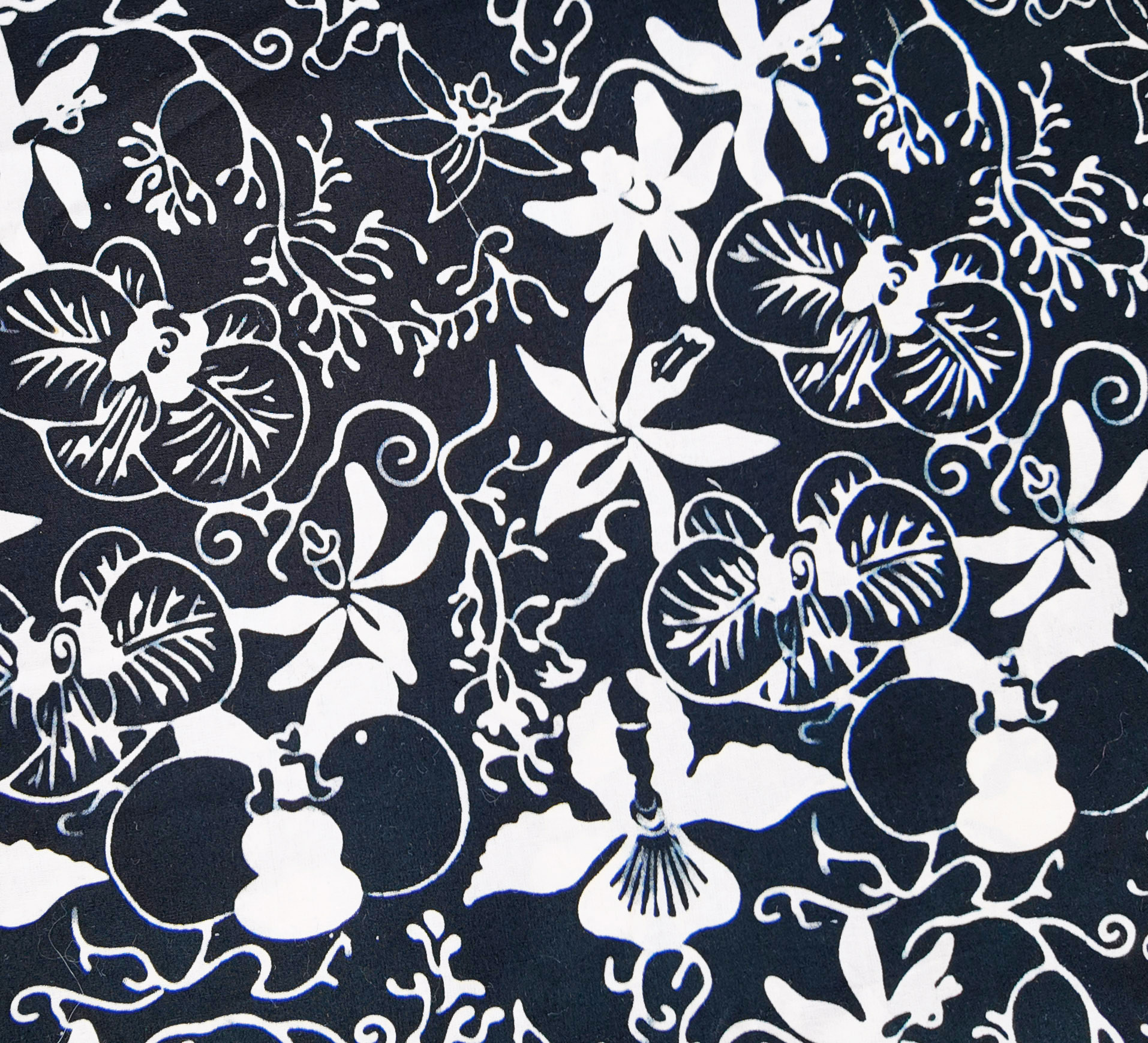 Fond noir décoré de grandes fleurs blanches aux contours fins et feuillages entrelacés, formant un motif végétal contrasté.