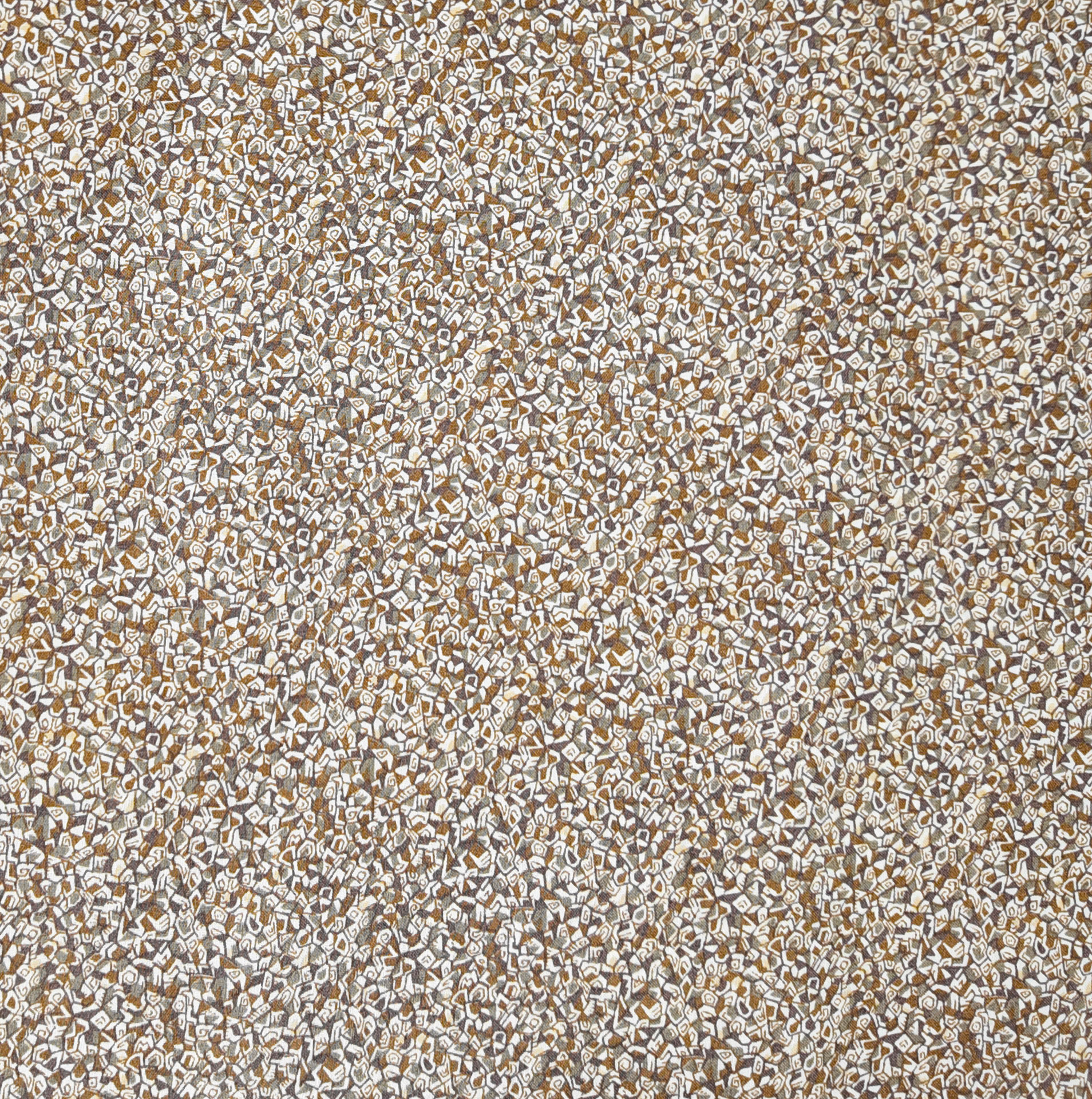 Une pluie de petits symboles ocre et crème anime la surface d’un fond brun clair. L’ensemble crée un effet vibrant et régulier, comme une mosaïque ancienne baignée de lumière.