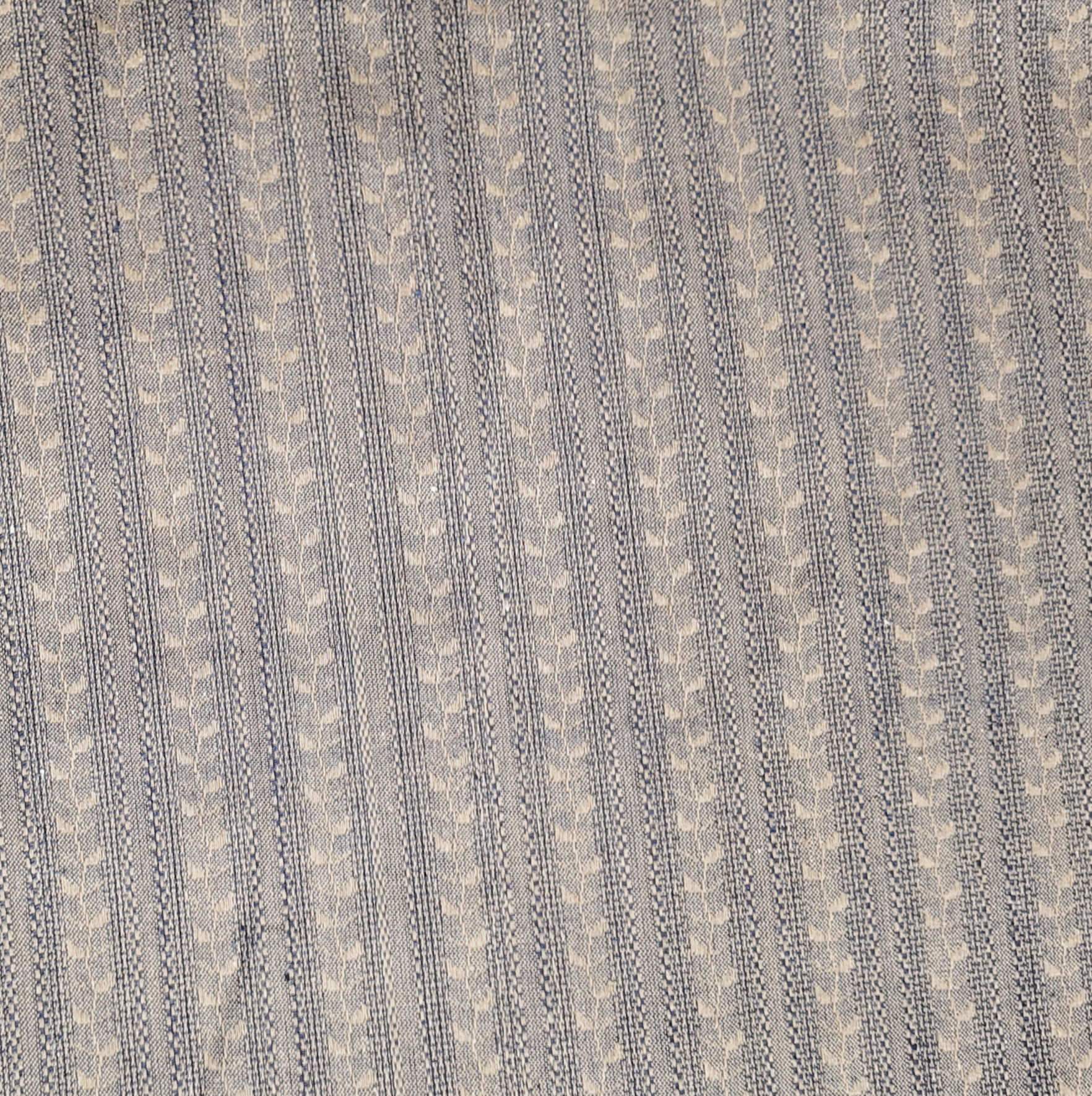 Sur un fond gris perle se dessine une alternance de lignes et de motifs tissés, réguliers et fins. Ce tissu offre une lecture rythmée, subtilement texturée.