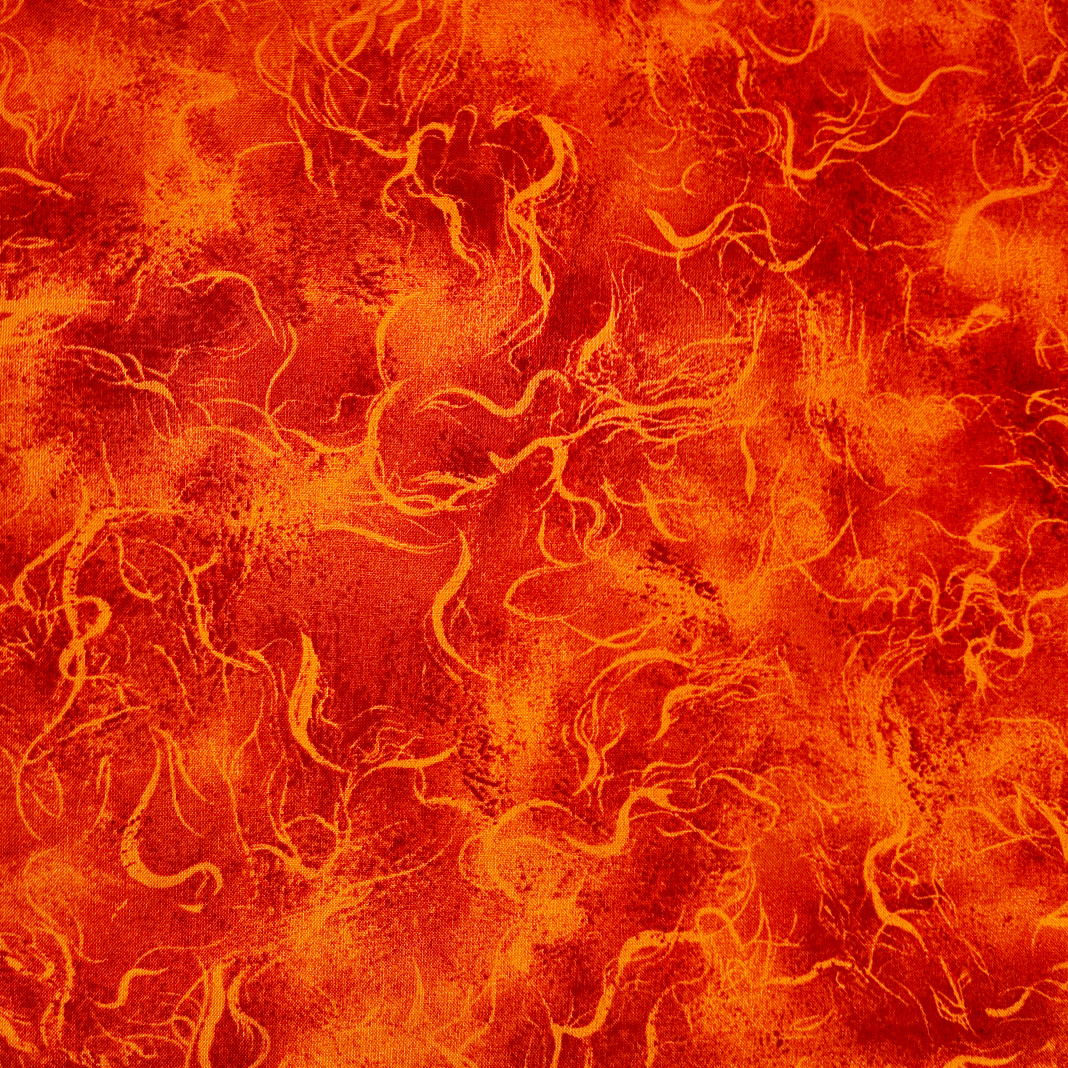 Un fond rouge incandescent traversé de filaments orangés, comme des flammes ondulantes. Ce tissu dégage une intensité vibrante et chaleureuse.