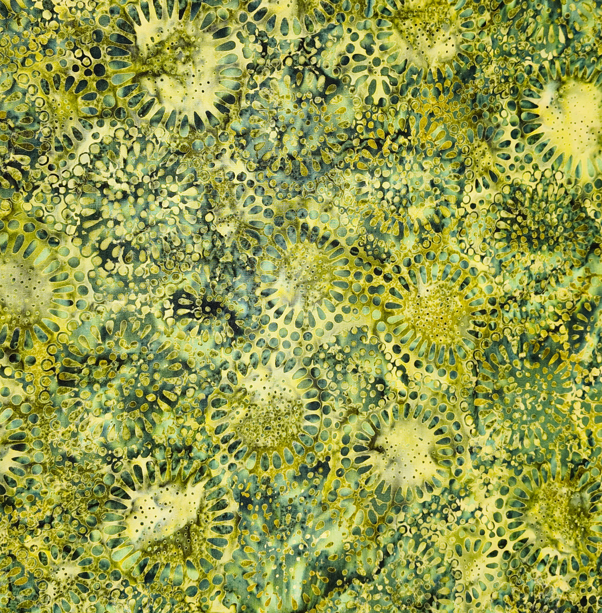 Une constellation de formes solaires, déclinées du jaune au vert mousse, se déploie comme un jardin aquatique éclatant.