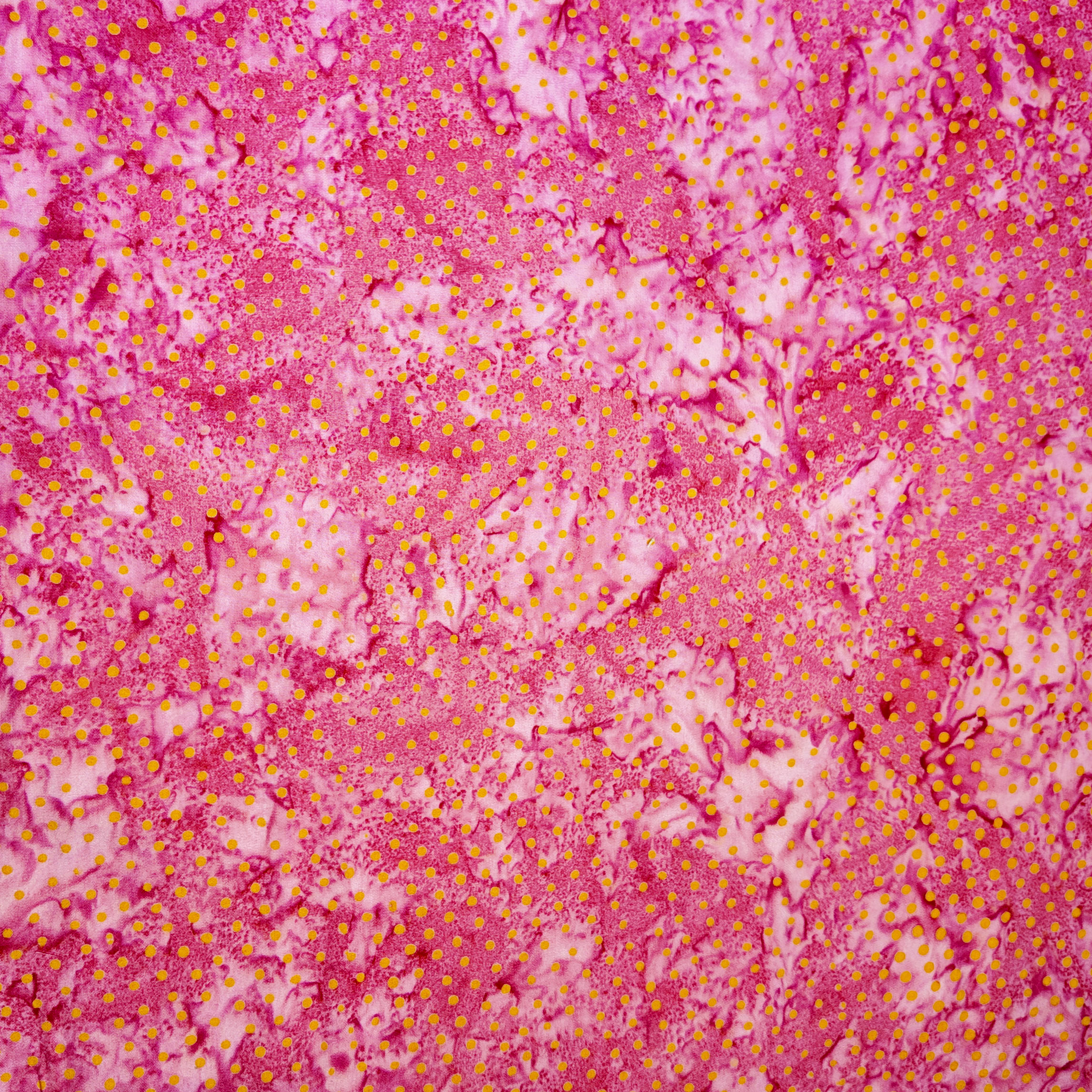 Un rose lumineux éclaboussé de petits points jaunes, rappelant une fleur tropicale en plein soleil.