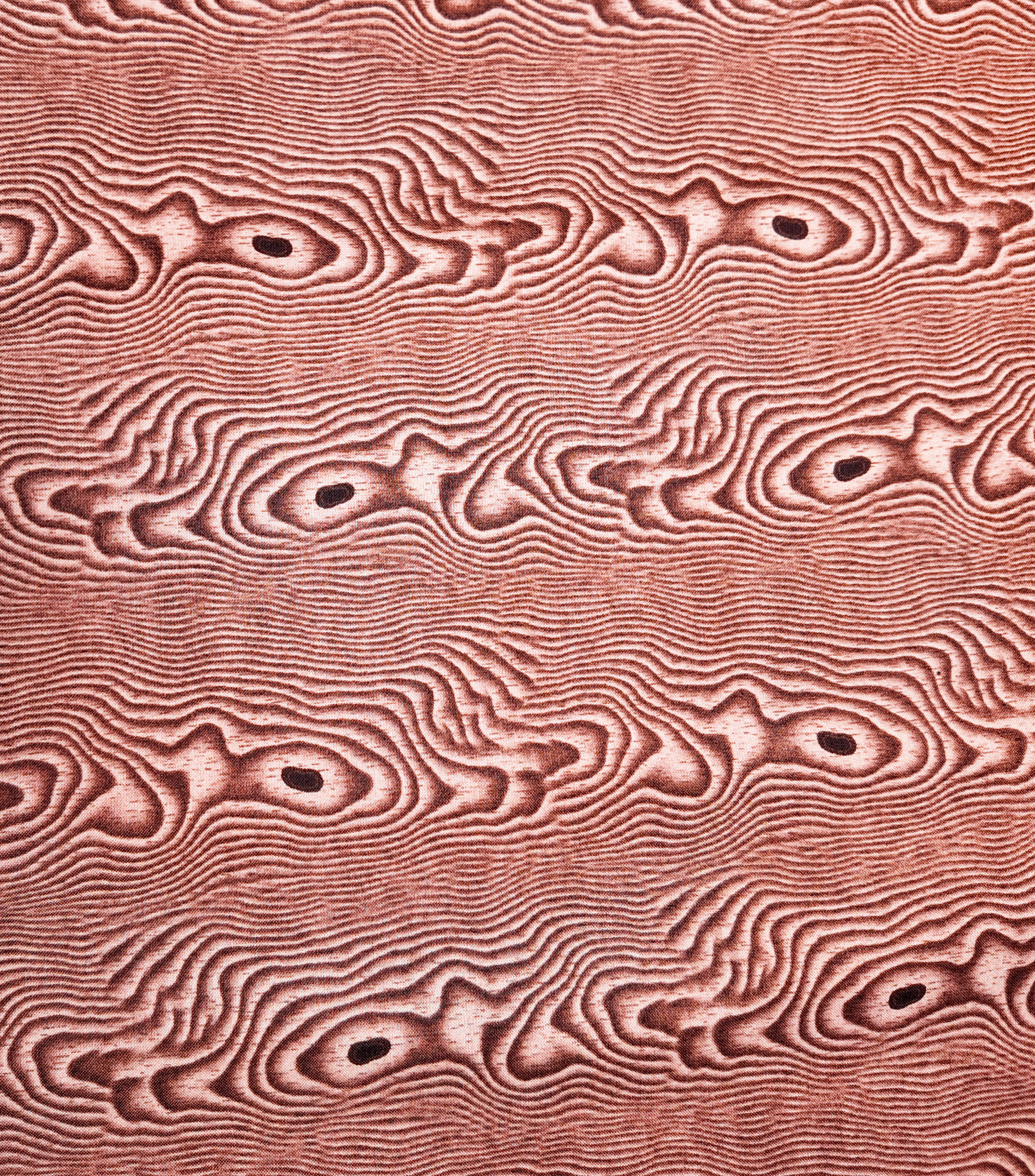 Des veinures brunes sinueuses se dessinent comme des cernes de bois, donnant au tissu un relief organique et chaud.