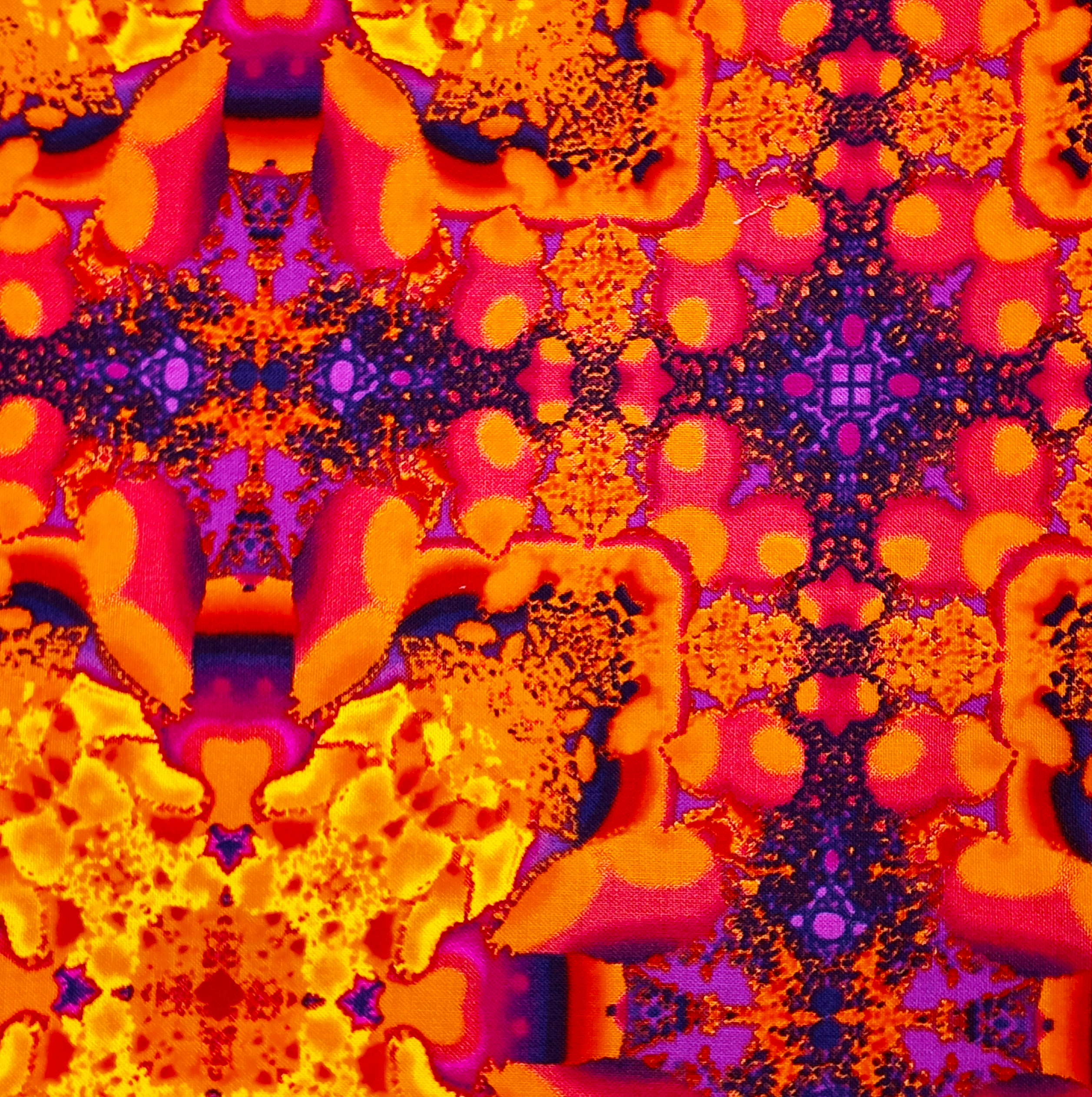 Un kaléidoscope incandescent de pourpre, orange et or compose une trame vibrante, presque en fusion lumineuse.